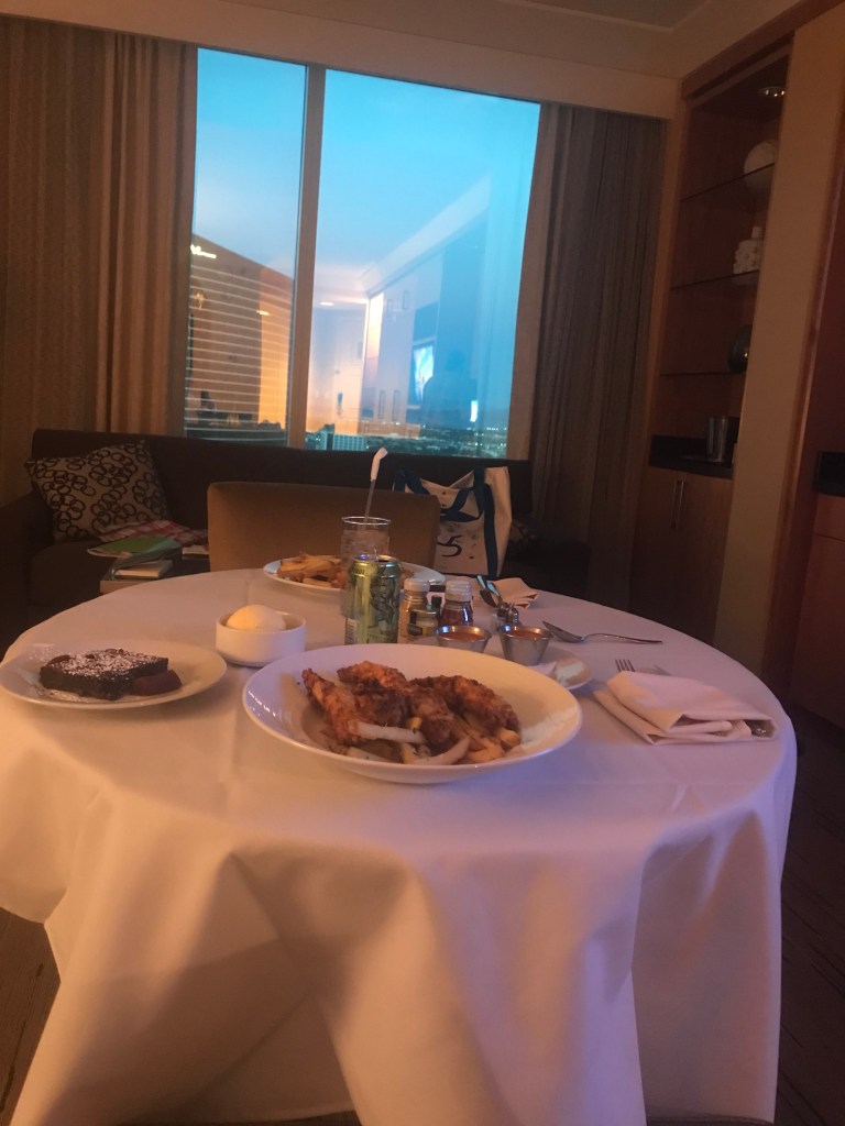 Once we finally made it back down, we headed straight back to the hotel to shower and spend some much needed time unwinding and relaxing. We had planned to have dinner in our hotel’s restaurant that night, but decided to get room service instead so that we could just relax and unwind after an extremely exhausting day. Having been our first ever time ordering room service, we were pretty thrilled by the experience (feel free to laugh at us, we certainly did). Ordering room service was such a fun experience for us and so incredibly relaxing! The man who delivered it was also very nice and professional. The food was delicious and it felt very romantic and intimate despite being in our pj’s and eating food that wasn’t what most would call elegant. I got a burger and Russ got chicken tenders, but all of the food was absolutely delicious!
